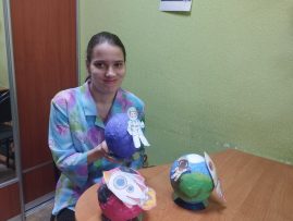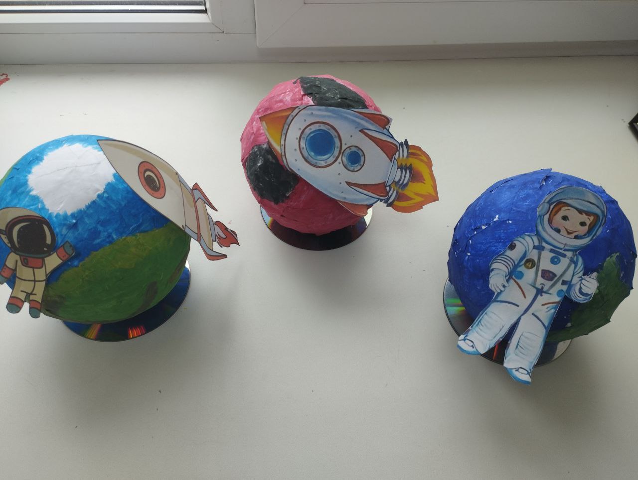 Творческое занятие прошло в технике папье-маше. Участники мастер-класса надували воздушные шары и обклеивали их в несколько слоёв газетами и салфетками. После многократных просушек покрасили гуашью и украсили аппликациями в виде ракет и космонавтов. Работа получилась яркой и красочной.