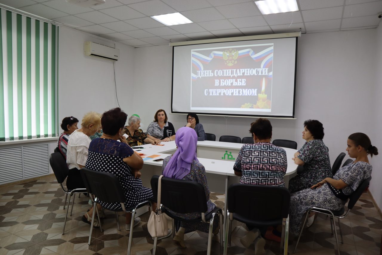 Сегодня специалист культурно-досугового отделения Икрянинского комплексного центра провела встречу с получателями социальных услуг на тему «Терроризм. Как не стать его жертвой». Она рассказала о значении этого дня и истории борьбы с терроризмом, вспомнила сотрудников силовых структур, журналистов, погибших при исполнении служебного долга. Особое внимание уделила трагедии 2004 года в Беслане.