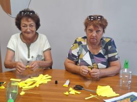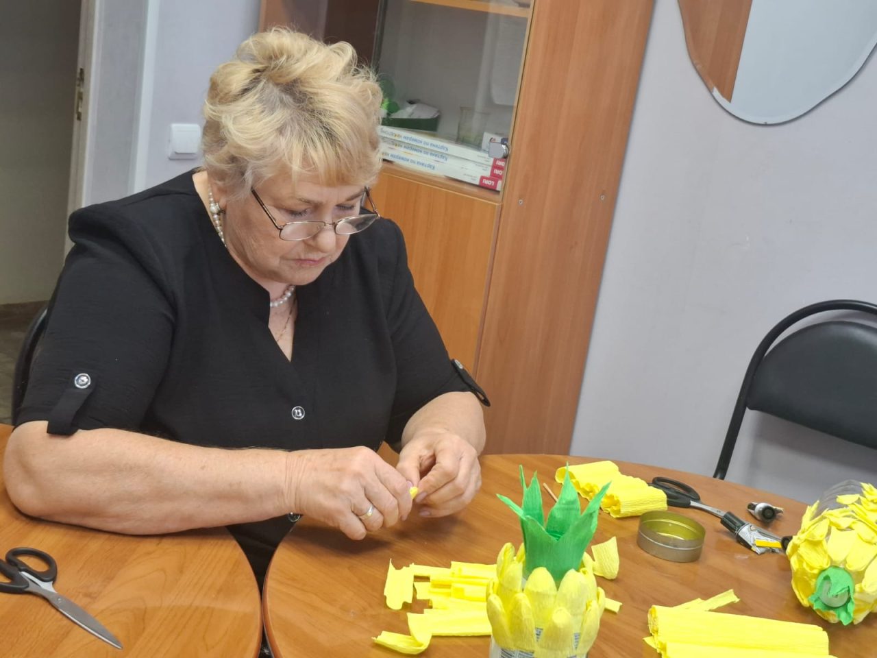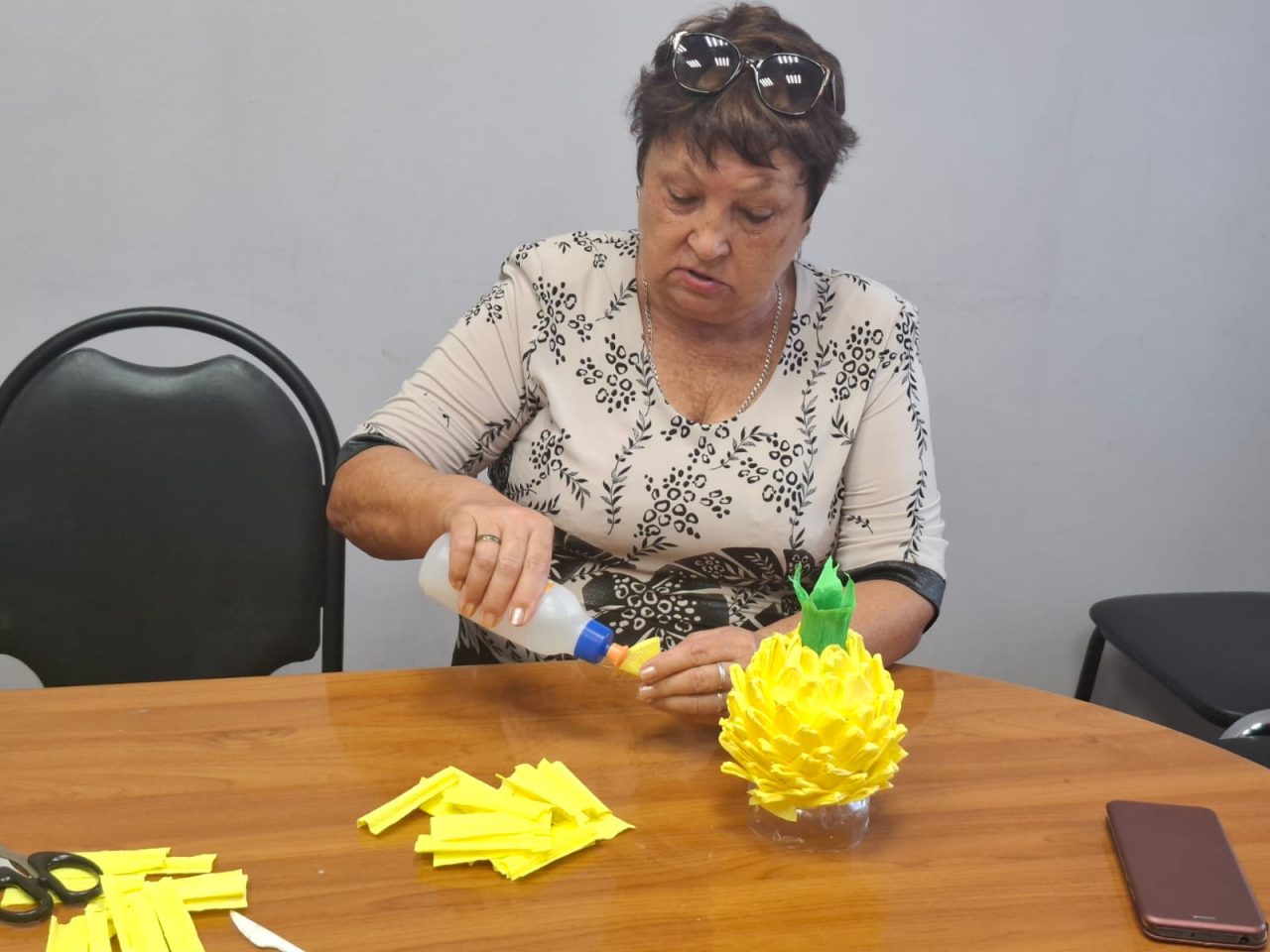 Получатели социальных услуг культурно -досугового отделения Икрянинского комплексного центра приняли участие в мастер-классе по изготовлению поделки из гофрированной бумаги. Руководитель студии рукоделия «Самоделкин» показала, как легко и просто гофрированную бумагу, и пластиковую бутылку можно превратить в красивый и реалистичный ананас.