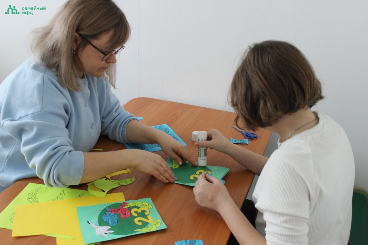 В преддверии праздника специалисты отделения «Семейный многофункциональный центр» провели мастер-класс по изготовлению подарочных открыток «Открытка ко Дню защитника Отечества своими руками». Они рассказали детям об этом замечательном празднике настоящих мужчин, о мужестве и героизме защитников. Специалисты познакомили юных получателей социальных услуг с образцами – эскизами поздравительных открыток и техникой выполнения поделки.